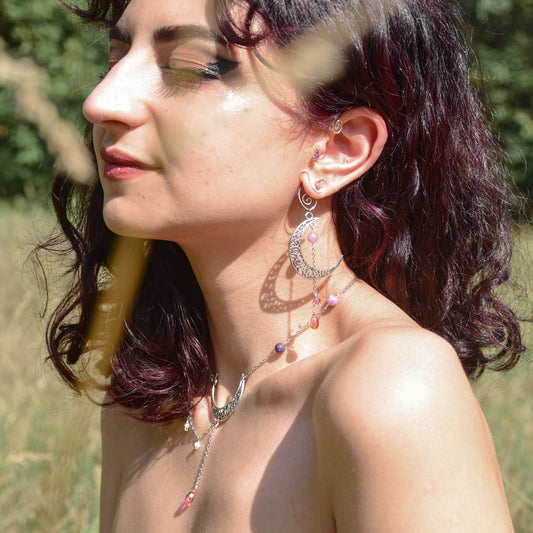 L’anello di congiunzione tra i design della collezione è infatti il legame con il mondo celeste nella sua versione notturna, fatta di contrapposizioni e antitesi che si ripropongono nell’asimmetria dei set di gioielli.